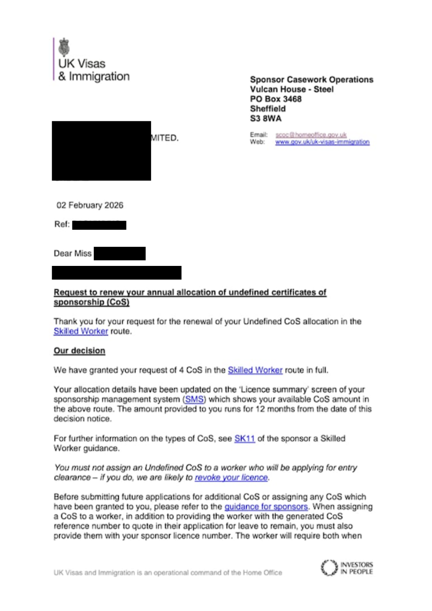 Our client, a care provider, has been granted 4 Undefined Certificates of Sponsorship (UCoS) by the Home Office. This is a significant outcome that allows our client to recruit skilled migrant workers from overseas to fill essential care roles.