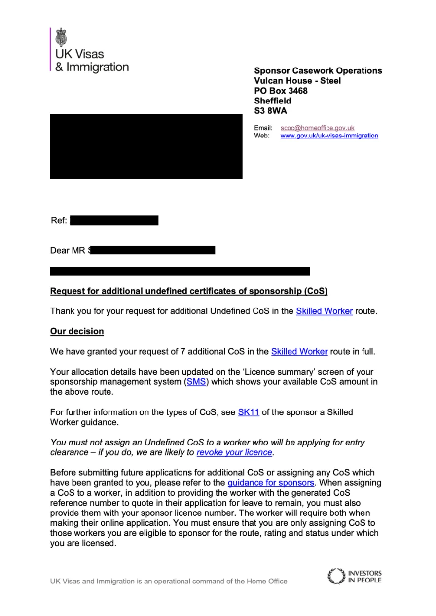 Our team prepared a detailed and well-evidenced application. We made sure the request clearly justified the need for each additional CoS, with specific information about the roles, including job descriptions, SOC codes, salary details, and working arrangements. We reviewed the client's existing compliance records to ensure there were no gaps that could raise questions during the Home Office's assessment. We also checked that every detail in the request was consistent with what was already recorded on the client's Sponsor Management System.