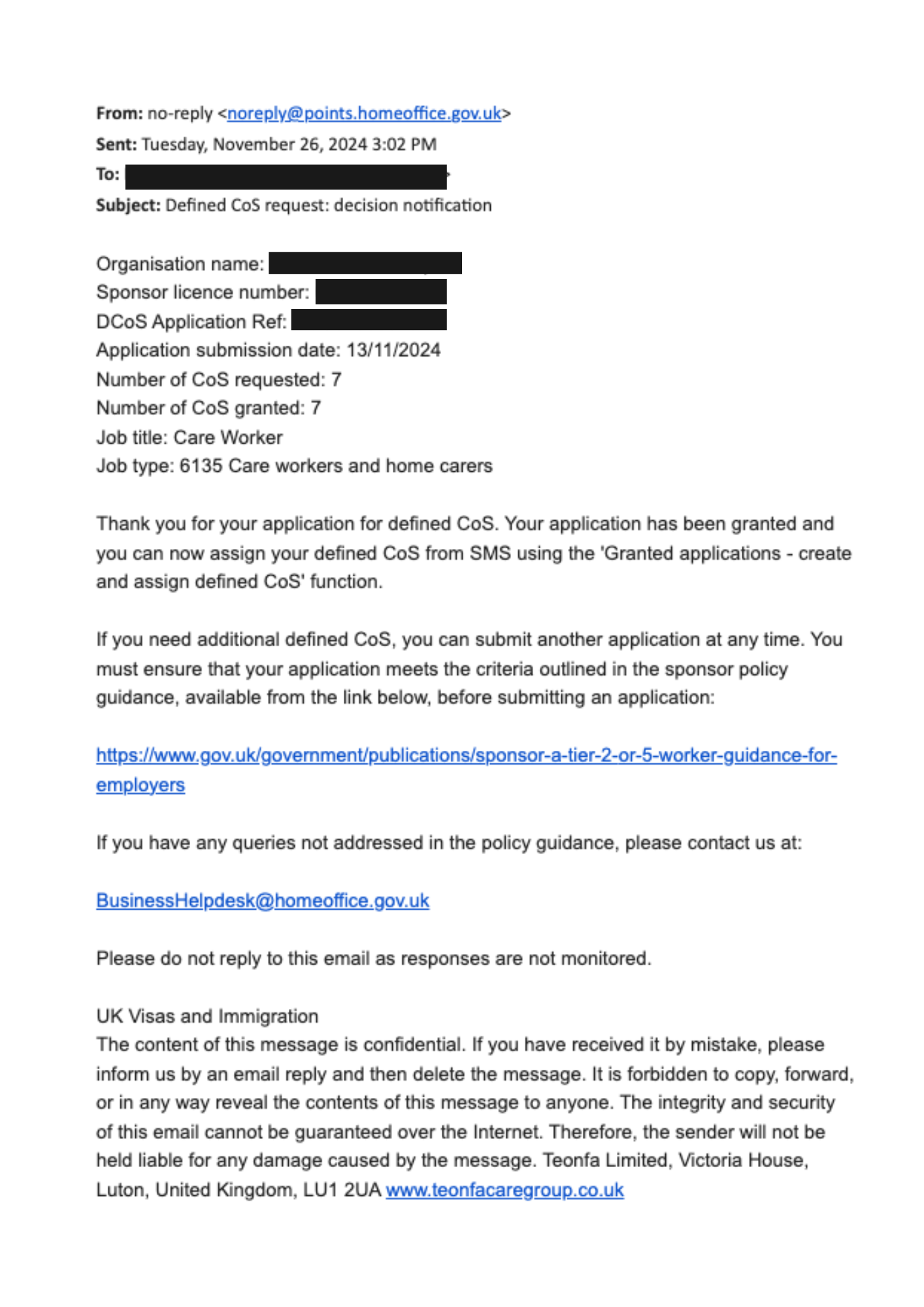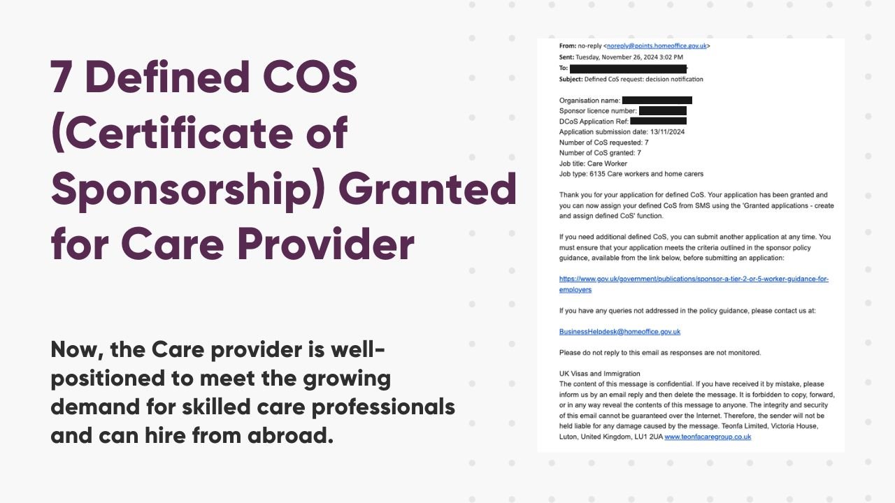 This achievement marks a significant turnaround because of Certificate of Sponsorship (CoS) refusals are common for care providers.