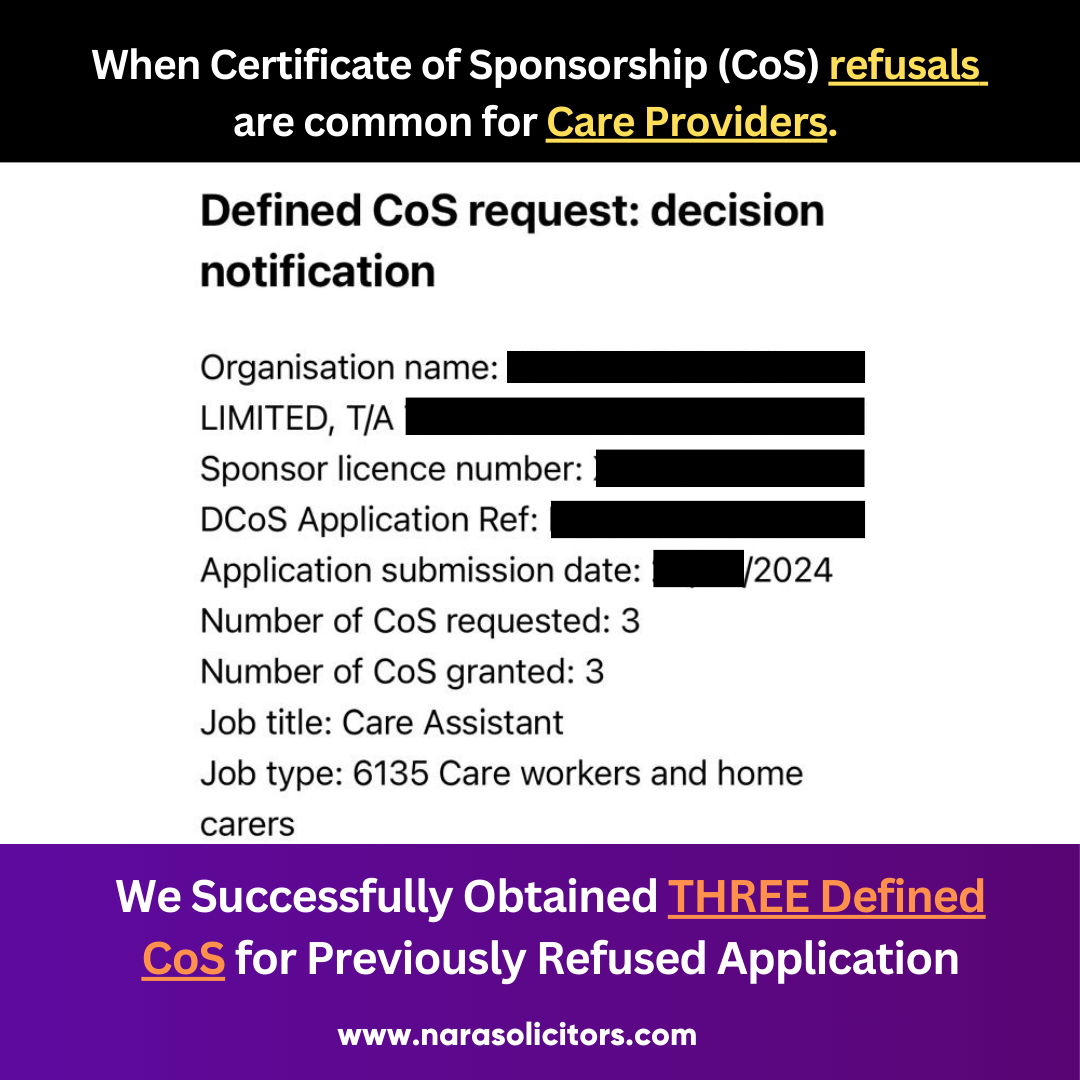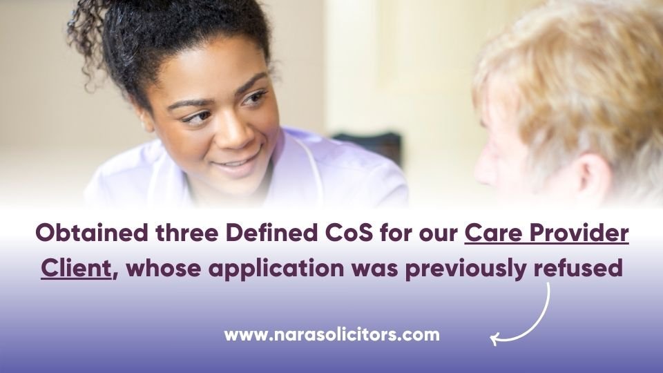 Our client, a care provider, had trouble getting Certificates of Sponsorship (CoS). After their first application was refused, they came to us for help. We carefully prepared a new application, making sure to include all the necessary details and additional information to support their case.