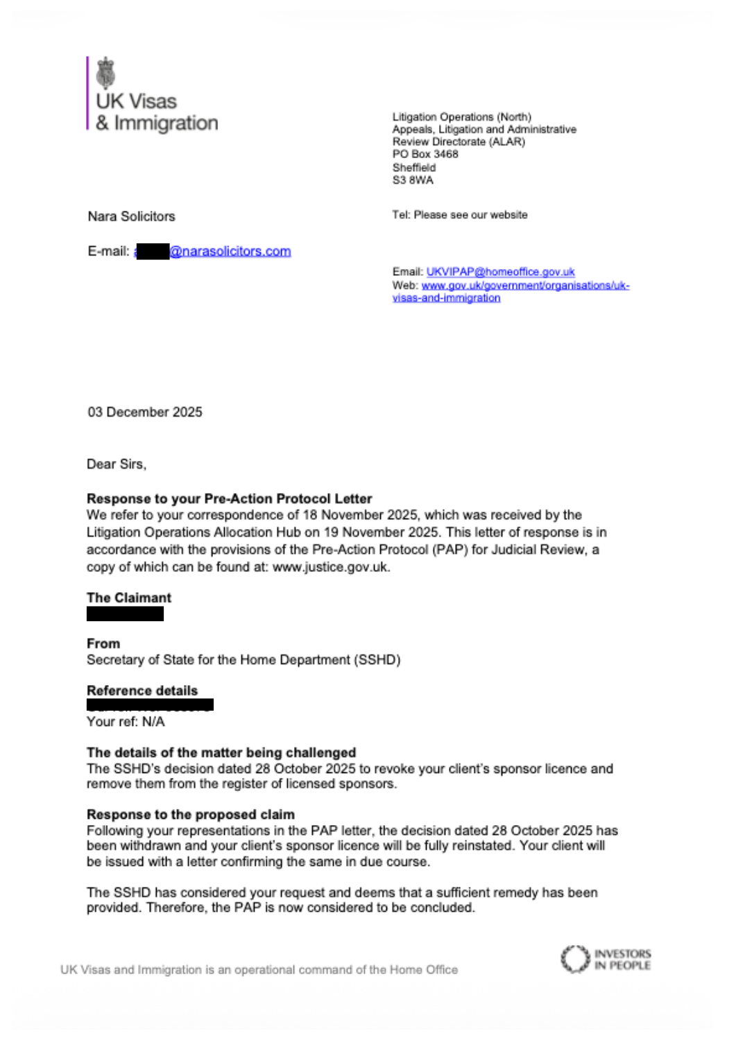 After reviewing the decision, our team prepared a detailed Pre Action Protocol (PAP) challenge, setting out why the revocation had been made incorrectly and why the decision required urgent reconsideration.