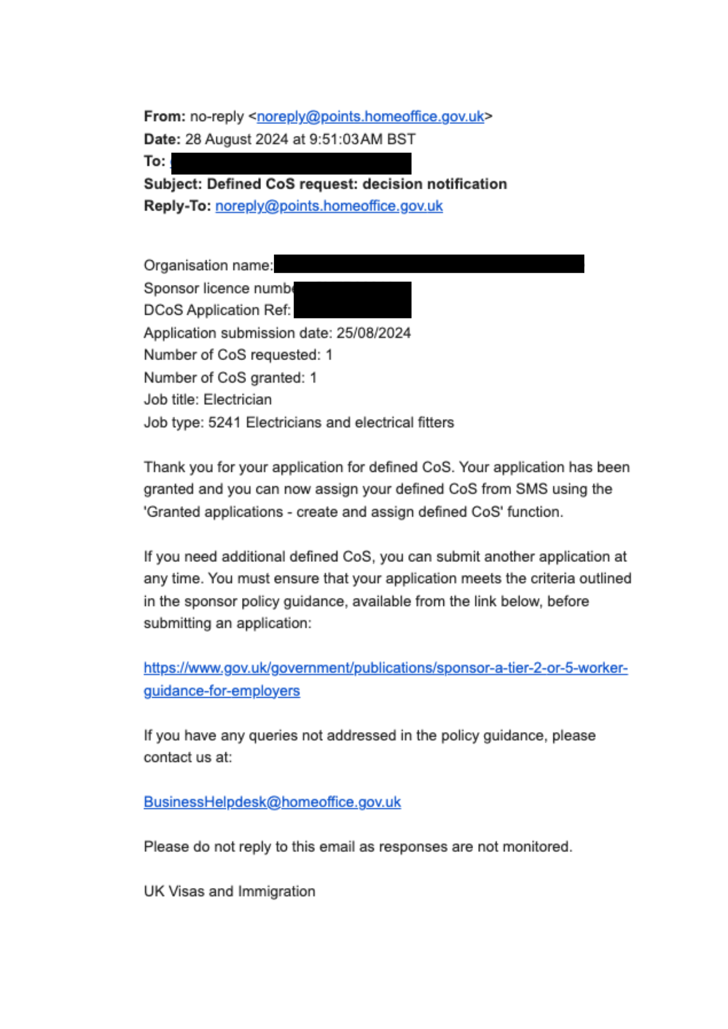 On 25/08/2024, we submitted the application on behalf of our client, requesting authorisation for a single skilled worker under the job title “Electrician” (Job type: 5241 Electricians and electrical fitters). We are delighted to share that the application was successful, and the Home Office granted the requested Certificate of Sponsorship on 28th aug.
