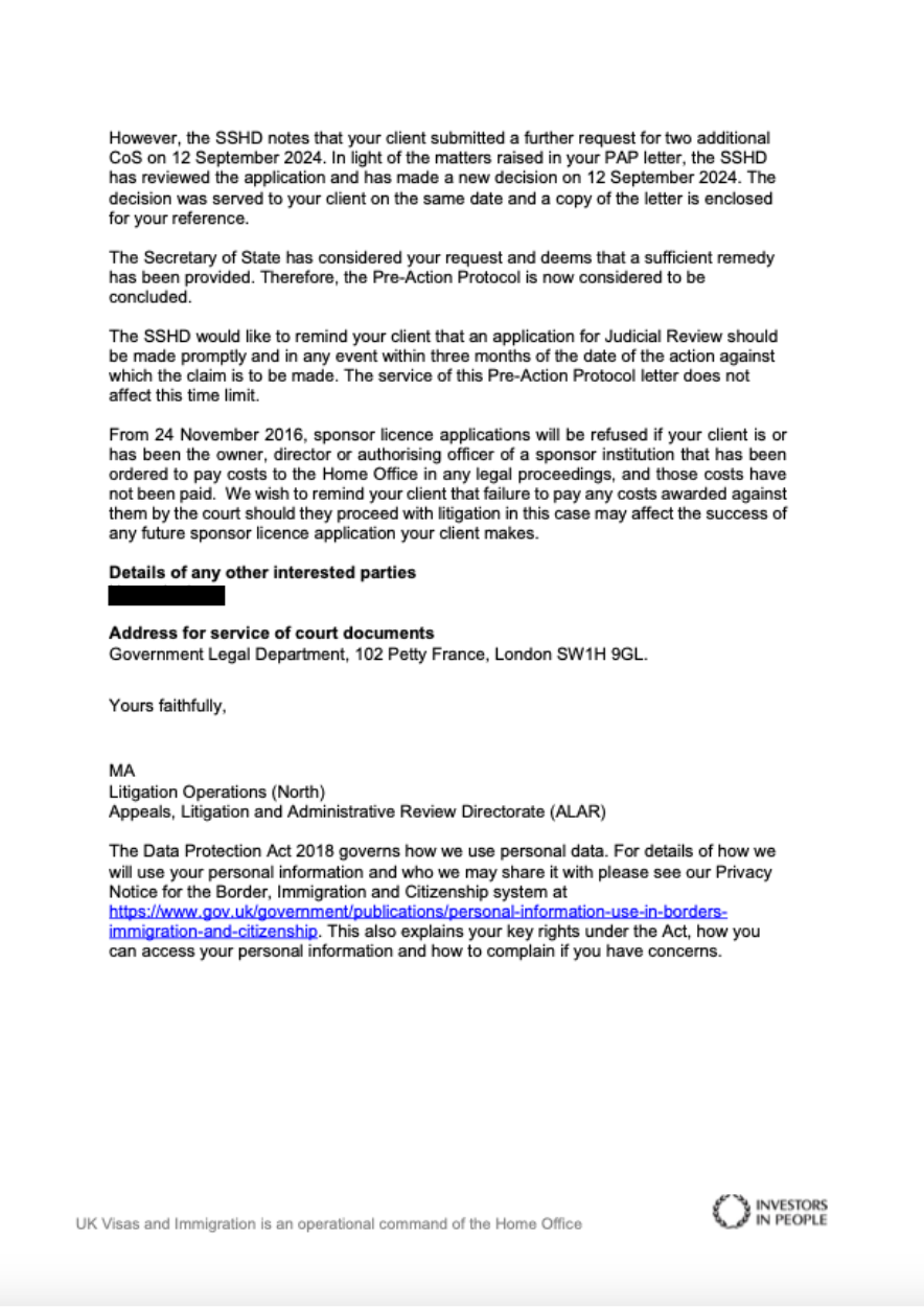 Upon review, they acknowledged that the initial decision made on 04 August 2024 was erroneous. Although the procedural constraints meant that the previous CoS application could not be reopened, the Home Office admitted that their decision to reject the application was made in error.