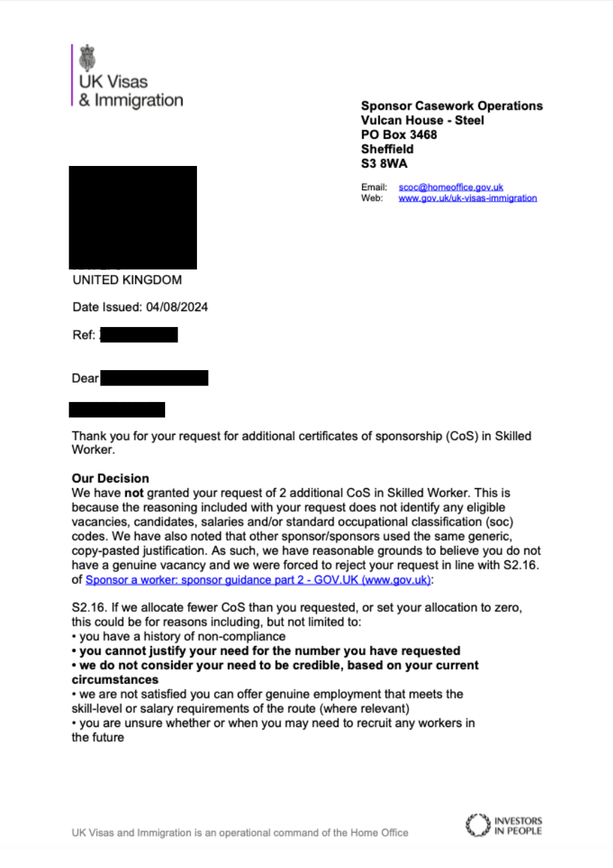 Our client sought to expand their workforce by applying for two additional Certificates of Sponsorship under the Skilled Worker category. Unfortunately, the Home Office rejected the application, citing insufficient information regarding the vacancies, candidates, salaries, and occupational classification (SOC) codes.