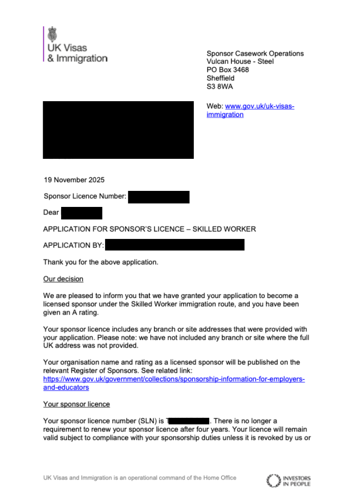 On 10 November 2025 the Home Office requested further information. We prepared and submitted a full response on 14 November. The Sponsor Licence was granted on 19 November.