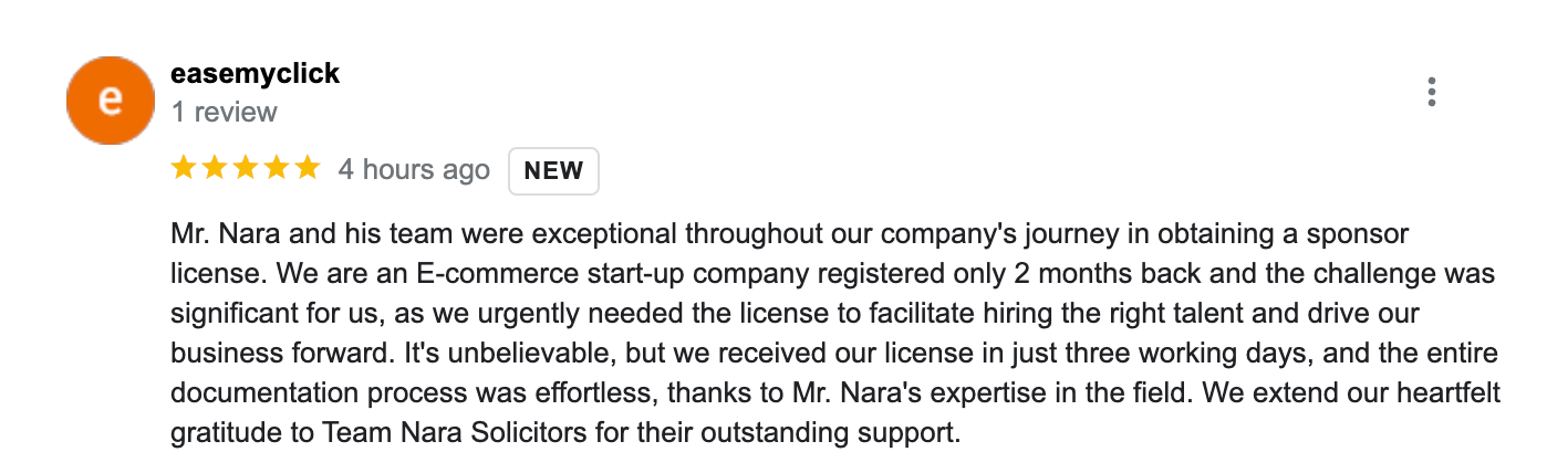 "Mr. Nara and his team were exceptional throughout our company's journey in obtaining a sponsor license. We are an E-commerce start-up company registered only 2 months back and the challenge was significant for us, as we urgently needed the license to facilitate hiring the right talent and drive our business forward. It's unbelievable, but we received our license in just three working days, and the entire documentation process was effortless, thanks to Mr. Nara's expertise in the field. We extend our heartfelt gratitude to Team Nara Solicitors for their outstanding support."
