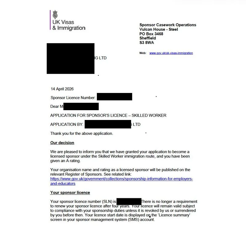 But they were unsure if they could even sponsor them. We assessed their eligibility, prepared a priority application, and the sponsor licence was granted the very next day after submitting supporting documents.