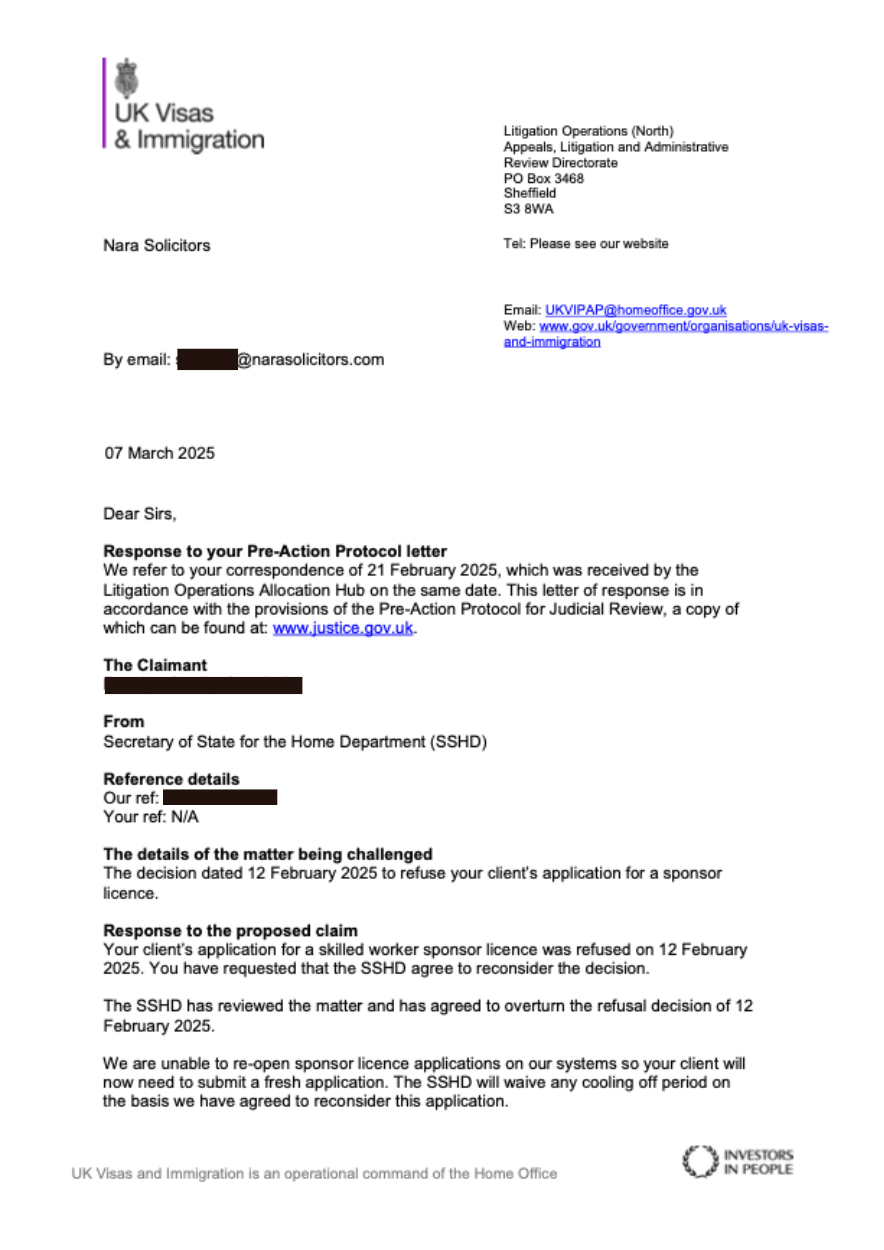 With time being critical, our Solicitors Samarth Singla, led by Sukhvinder Singh Nara, swiftly prepared a Pre-Action Protocol (PAP) letter, which was submitted to the Home Office on 21st February 2025, resulting in the Home Office overturning the refusal, waiving the cooling-off period, and agreeing that the new consideration will be expediated so there is no requirement for your client to pay the priority fee.