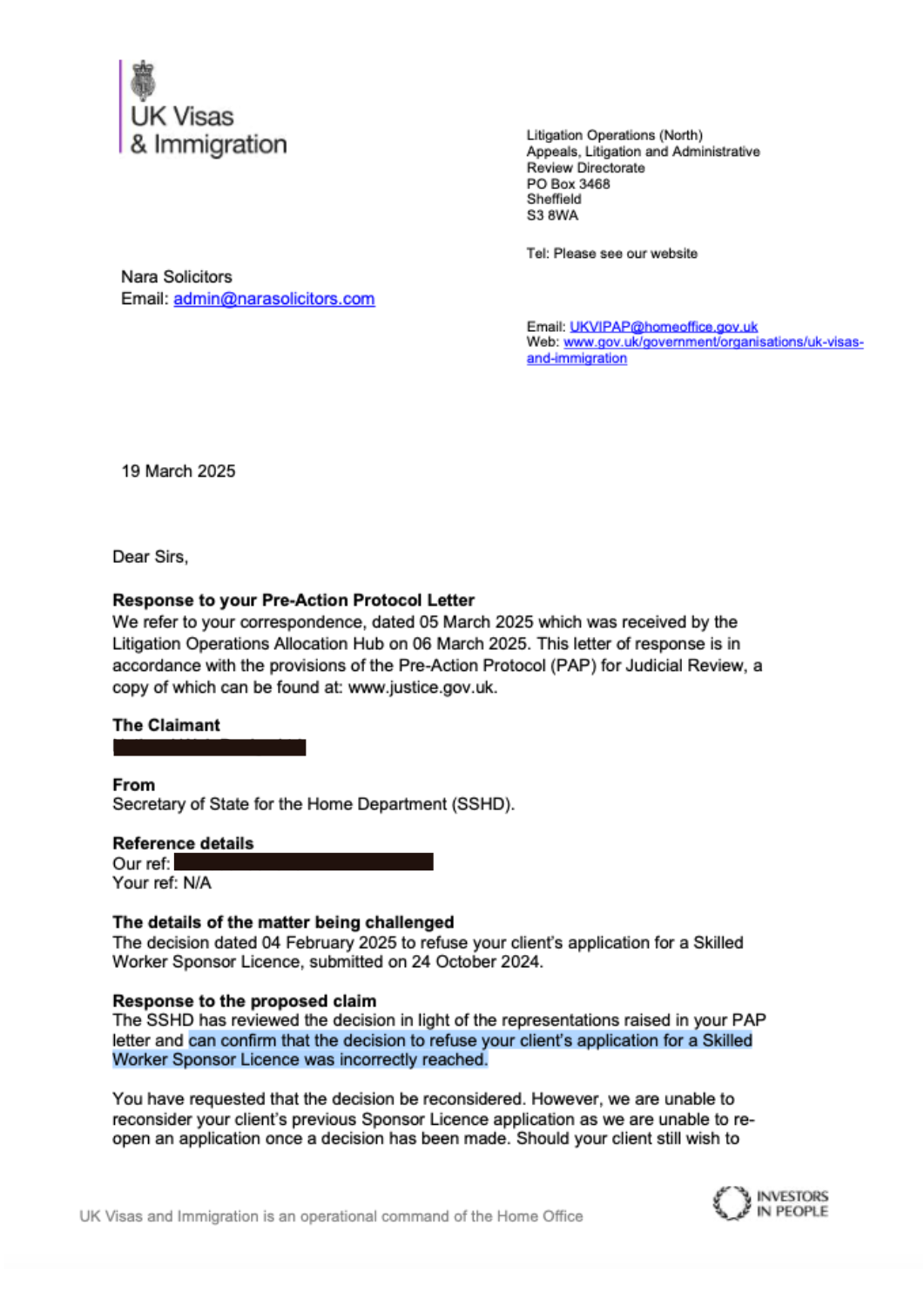 After application refusal, the company approached Nara Solicitors for expert legal assistance. Our legal team carefully reviewed the refusal and identified critical errors in the Home Office’s assessment and advised to challenge the refusal through PAP. A Pre-Action Protocol (PAP) letter was submitted, arguing that: