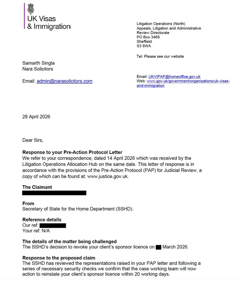 We are proud to share another success story from NARA Solicitors. Our client's licence was revoked after a CoS was assigned to a brother-in-law, and later reinstated following a successful PAP challenge.
