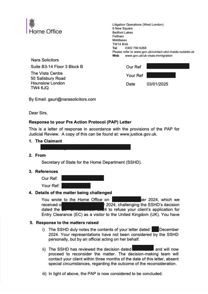 The family approached us after the refusal, and we swiftly took action. We challenged the decision by way of a Pre-Action Protocol (PAP), notifying the Home Office of our intention to pursue a Judicial Review if the refusal wasn’t overturned within 14 days.