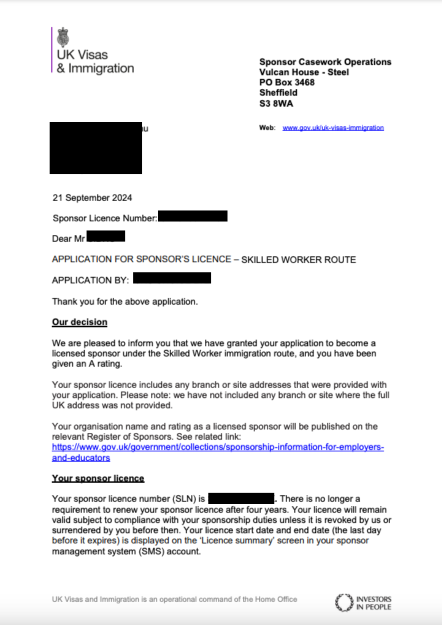 The application documents were submitted on 17th September and approved within just 4 working days, on 21st September. This expedited process will help the company hire international talent, ensuring they meet their operational needs.